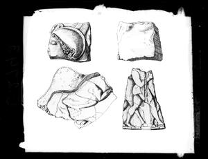 Part of the collection of images, 1924-1927, of the British School at Athens excavations at Sparta, Laconia. The original description in the SPHS register reads: "Sparta 1927, Acropolis. Reliefs in Parian marble, from shield, head of Athena to r".