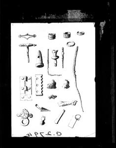 Part of the collection of images, 1924-1927, of the British School at Athens excavations at Sparta, Laconia. The original description in the SPHS register reads: "Sparta 1926, Acropolis. Various early bronzes: pins, hinges, helmeted head &c.".