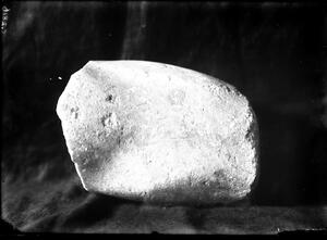 Part of the collection of images, 1924-1927, of the British School at Athens excavations at Sparta, Laconia. The original description in the SPHS register reads: "Sparta 1924, Acropolis. Top of votive marble stele inscribed Teîhis (retrograde)".