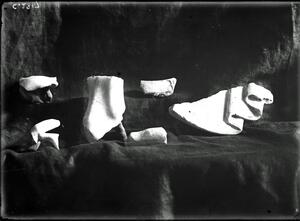 Part of the collection of images, 1924-1927, of the British School at Athens excavations at Sparta, Laconia. The original description in the SPHS register reads: "Sparta 1927, Acropolis. fragment of plastic vase with large painted eyes (r.) and t.c. foot (l.)".