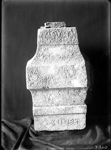 Part of the collection of images, 1924-1927, of the British School at Athens excavations at Sparta, Laconia. The original description in the SPHS register reads: "Sparta 1927, Acropolis. Archaic stele with hymn to Athena, front with ll. 1-3".