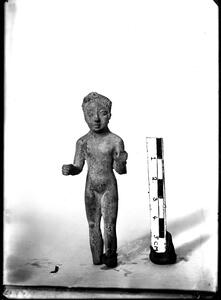 Part of the collection of images, 1924-1927, of the British School at Athens excavations at Sparta, Laconia. The original description in the SPHS register reads: "Sparta 1927, Acropolis. bronze. Archaic nude female statuette - back view".