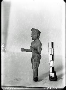 Part of the collection of images, 1924-1927, of the British School at Athens excavations at Sparta, Laconia. The original description in the SPHS register reads: "Sparta 1927, Acropolis. bronze. Archaic nude female statuette - profile r".