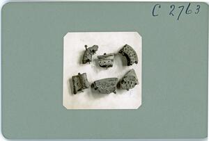 Part of the collection of images, 1906-1910 and 1924-1927, of the British School at Athens excavations at Sparta, Laconia. The original description in the SPHS register reads: "Sparta, (various years' digs). Bronze. Seven archaic protomai".