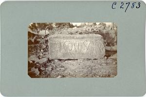 Part of the collection of images, 1924-1927, of the British School at Athens excavations at Sparta, Laconia. The original description in the SPHS register reads: "Sparta 1926, Acropolis. Part of Latin inscription with name Emp. Tiberius".