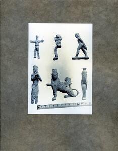 Part of the collection of images, 1906-1910 and 1924-1927, of the British School at Athens excavations at Sparta, Laconia. The original description in the SPHS register reads: "Sparta, (various years' digs). Six Bronze statuettes: Acropolis: One is a sphinx, one a fluta player".