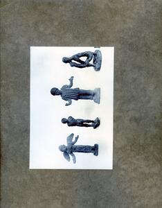 Part of the collection of images, 1906-1910 and 1924-1927, of the British School at Athens excavations at Sparta, Laconia. The original description in the SPHS register reads: "Sparta, (various years' digs). Four Bronze statuettes: Acropolis: one is Nike, one a negress, one squatting Geometric man".
