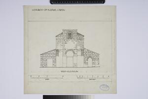 A preliminary drawing entitled in: 'Church of Saint Basil Arta The West End' showing the west elevation of the church on the front, looking east in ink with pencil annotations. Further annotation survive in pencil on front ('scale of feet') and back ('1.8').