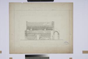 A preliminary drawing entitled 'Arta Church of S. Basil' and labelled: 'North Elevation'. The front shows is the north elevation of the church, looking south, in ink. Further annotation survives in pencil both on the front ( 'N°3'; 'Scale of feet'; 'Scale of metres', 'reduce to 6 3/4') and the back ('1.5').