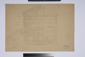 A preliminary drawing shoiwng the ground plan of the church in ink with annotations in pencil . Further annotation survive in pencil both on the front ('Church of Saint Basil'; 'Bema'; 'Arta S. Basil'; 'Scale 1/2 inche to 1 foot') and the back ('1.3').