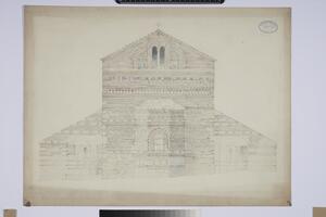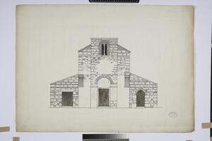 A preliminary drawing entitled, 'Church of S. Basil Arta', and labelled 'West Elevation'. The front shows the west elevation of the church, looking east, in ink with annotations in pencil. Further annotation survive in pencil both on the front ('N° 2') and the back ('1.4'). On the back is a sketch of the longitudinal section of an unidentified domed church.