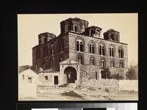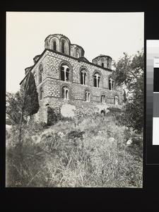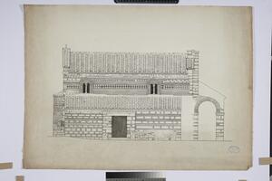 A preliminary drawing showing the east elevation of the church, looking west on the front. Unfinished annotated pencil sketches of the two ceramic relief icons that decorate the eastern tympanon of the church survive on the back. Further annotation survives in pencil both on the front ('St Basil Arta') and the back ('St Basil Arta'; '1.6').