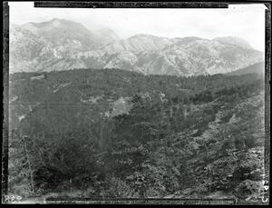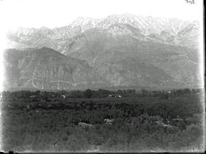 Part of the collection of images, 1906-1910, of the British School at Athens excavations at Sparta, Laconia. The original description in the SPHS register reads: "Sparta: Taygetos from Acropolis of Sparta, DUP #2".