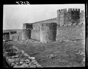 Part of a set of images taken by F.W. Hasluck in 1908 when he visited Aenos, Phocaea, Lemnos and Mytilene to document Frankish monuments. The original description in the SPHS register reads:"Mytilene: Walls of upper Castle".