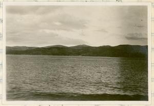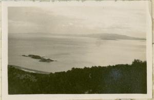 View of sea [near Salamís] with faint mountains in the background.