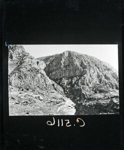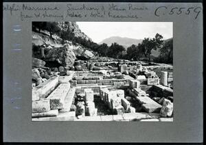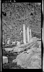 The original description in the SPHS register reads: "Delphi: Athenian treasury, view towards Phaidriades showing back of treasury".