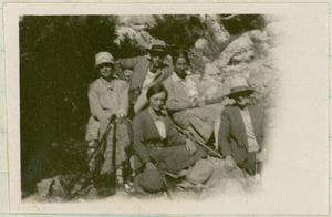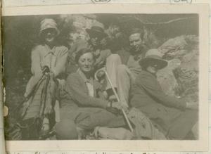 Group photograph of Miss Turnbull, Hilda White, John Pendlebury, Sylvia Benton and Winifred Lamb, sitting down on rocks.