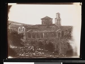 Longitudinal section and ground plan of the Koimesis church - Longitudinal section and ground plan of the Hagios Ioannis church - Ground plan of the Hagioi Theodoroi church. The drawing is entitled in ink: 'Chalandriza Elis Greece'. It is labelled in ink: 'Church of the Koimesis'. 'Hagios Ioannis', Hagios Theodoros'. Further annotation in ink survives.