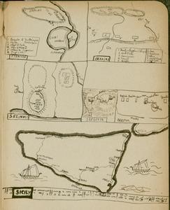 Hand drawn maps of Sicily and archaeological sites in Sicily and Italy: Syracuse, Akragas [at Agrigento], Selinous [Selinunte], [Rovine di] Segesta, and Paestum