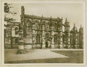 The page in the travel log this photograph is pasted onto is labelled, in the upper right corner, 'Melrose Abbey, Edinburgh', but the photo is of the exterior of Rosslyn Chapel, Roslin, Scotland