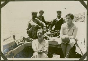 Photograph of group in a boat off Pseira [Nisída Pseíra] ([Hilda] White, Miss Hawson, Nikolaos [Saradakis], the boatman and [“Το παιδί”, the boy], Crete