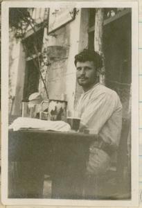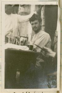 A young man sitting at a table with a drink [guide for visiting the Amphiareion]. The group included John Pendlebury, Hilda White and Professor William Dudley Woodhead.