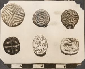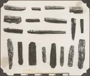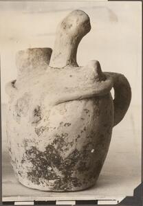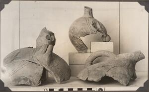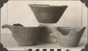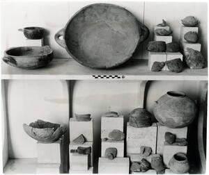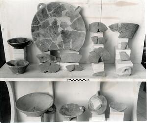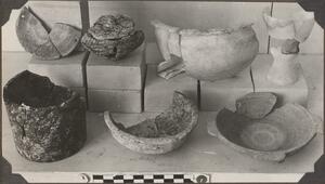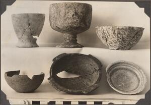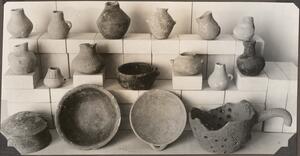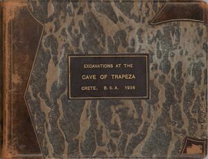 Photograph album prepared for the 1936 BSA exhibition (probably by Mercy Money-Coutts according to a note left inside). Contains a brief description of the cave and explanation of the excavation; maps and plans of Crete, the Lasithi Plain and Trapeza cave; a list of sites in the Lasithi Plain; diagrams of finds from the cave; and photographs of the cave, surrounding landscape and finds. A significant number of photographs were taken out of the volume, and are most likely the loose photographs which have been added here. 4 photographs (items number 31-34) have been placed back into the album as it was clear where they had come from. The maps, plans and diagrams are all exactly the same as those published in ‘Excavations in the Plain of Lasithi. I. The Cave of Trapeza’ by H. W. Pendlebury, J. D. S. Pendlebury and M. B. Money-Coutts, in The Annual of the British School at Athens, Vol. 36 (1935/1936), pp. 5-131. Some of the photographs in the album and the loose photographs are the same as those published, others appear to be the published items prior to restoration. All of the photographs (besides a landscape panorama and one more landscape photograph) are prints from negatives in PEN 4/3/3. The “Tr” numbers (which the photographs are labelled with) relate to negatives (in PEN 4/3/3), to photograph numbers in the excavation notebook PEN 4/1/2 and negative numbers in “photographic catalogue” in excavation notebook PEN 4/1/1.