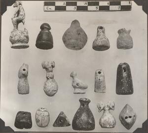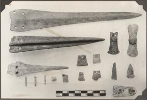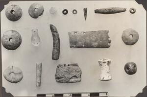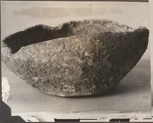 Material relating to the excavation of Trapeza Cave near Tzermiado, Lasíthi Plain, Crete (4-19 May 1936). This excavation took place under the auspices of the British School at Athens and was conducted by John Pendlebury, Hilda Pendlebury, Mercy Money-Coutts and Ralph Lavers. With Manolaki (from Knossos) and Ioannes Meliarakes as foremen. The notebook contains a catalogue [mainly in Hilda Pendlebury’s handwriting] of objects found at the excavation divided into bronzes and metal, stone, seals, pottery, figurines and miscellaneous. The catalogue contains object numbers, provenance (exact section of cave), description of object, a small sketch, size and photograph number. Also includes a list [in John Pendlebury’s handwriting] of objects left at [the excavation house in Tzermiado] such as utensils and crockery.