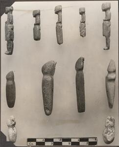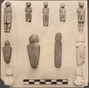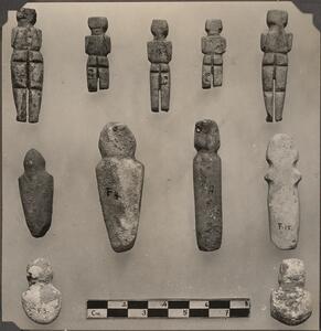 Material relating to the excavation of Trapeza Cave near Tzermiado, Lasíthi Plain, Crete (4-19 May 1936). This excavation took place under the auspices of the British School at Athens and was conducted by John Pendlebury, Hilda Pendlebury, Mercy Money-Coutts and Ralph Lavers. With Manolaki (from Knossos) and Ioannes Meliarakes as foremen. The notebook contains: a list of workmen (mainly from Tzermiado); a description of the cave including location, what locals said about the cave and sherds found on an earlier trip in June and July 1935; diagrams of stroses [stratigraphy] inside and outside the cave; a hand drawn plan of the Lasithi plain; a cross section diagram of part of the cave; a rough diagram of the cave divided into sections based on a sketch by [Ralph] Lavers; a “diagrammatic section of the cave, showing strata excavated”; and a catalogue of photographs listing negative numbers, description and how numbered objects were arranged in the photographs. The notebook also contains (written from the other end of the book): notes on the analysis of “stroses” [stratigraphical layers] including details of objects found in sections and bones thrown away; catalogues of finds divided into “stone vases and objects”, “beads, buttons etc and miscellaneous”, “metal” detailing reference numbers, material, dimensions, any remarks, the provenance (exact section of cave), whether there was a drawing and photograph number; and lists of seals and figurines divided into type and detailing reference number and material. Mostly in John Pendlebury’s handwriting, but also includes notes in Hilda Pendlebury’s handwriting and another person’s [possibly Mercy Money-Coutts or Ralph Lavers].