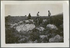 [PEN/7/3/4/3], Photograph of John Pendlebury looking and pointing at the ground, with 3 others standing by, at “Koutsokera Tholos” [Koutsokéra tombs], Crete, [9 Apr 1934]