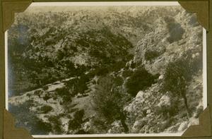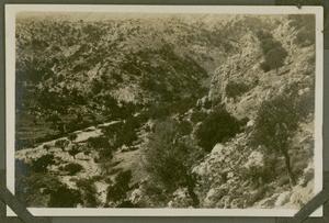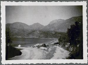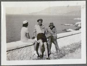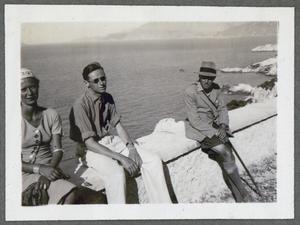 [PEN/7/2/6/103], Photograph of Joan Lloyd, Richard Wyndham and John Pendlebury, sitting on a wall on the coastal “Road to Pakhyammos” [Pacheía Ámmos], Crete, 21 Apr 1934