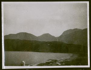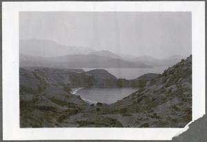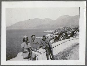 [PEN/7/2/6/104], Photograph of Joan Lloyd, Seton Lloyd and John Pendlebury, sitting on a wall on the coastal “Road to Pakhyammos” [Pacheía Ámmos], Crete, 21 Apr 1934