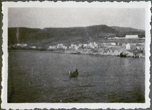 [PEN/7/2/6/105], Photograph of Joan Lloyd, Seton Lloyd and John Pendlebury, sitting on a wall on the coastal “Road to Pakhyammos” [Pacheía Ámmos], Crete, 21 Apr 1934