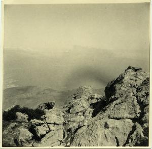 Enlargement of a photograph [which is part of a “Panorama from Stavromenos, the summit of Apendi Kavousi [Óros Thryptís Mountain]” showing the view “South East, Makrygialos [Makry-Gialos] and the Ampelos promontory”, Crete]