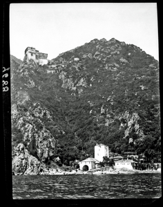 Part of a series of images taken by F.W. Hasluck during the course of his visit to Mount Athos in 1911. The original description in the SPHS register reads: "Athos: Simopetra, Arsenal & monastery from sea".