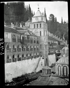 Part of a series of images taken by F.W. Hasluck during the course of his visit to Mount Athos in 1911. The original description in the SPHS register reads: "Athos: Zográphou: E. side of court with clock tower".