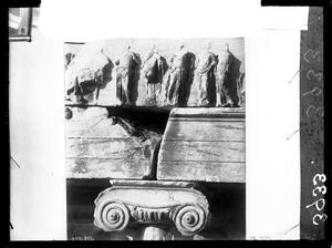 The original description in the SPHS register reads: "Nike Apteros entablature. Cap architrave & frieze in situ".