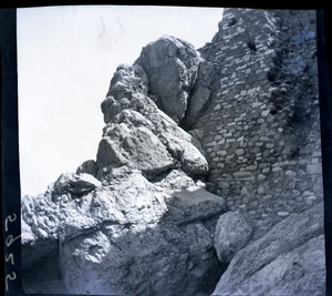 Part of a group of images donated by the Argonaut Camera Club, taken on excursions and cruises in Greece and Asia Minor. The original description in the SPHS register reads: "Athens: Acropolis . Crouching rock on N. wall (Persian ascent?)".