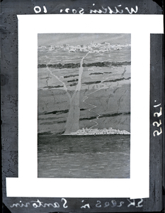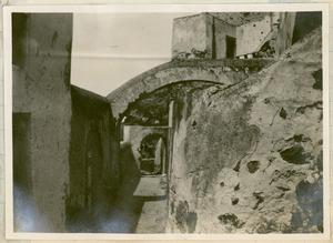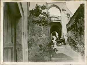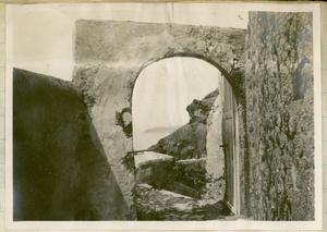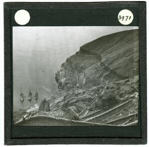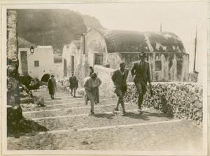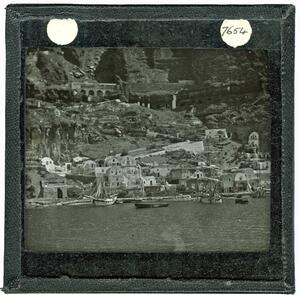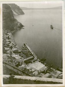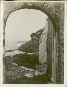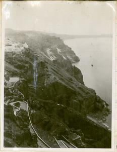 Part of a group of images donated by the Argonaut Camera Club, taken on excursions and cruises in Greece and Asia Minor. The original description in the SPHS register reads: "Thera: entrance to Santorini, from watercoulour".