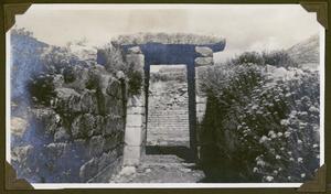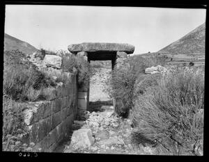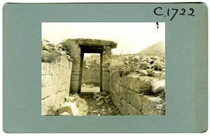 Part of a collection of images of the BSA's 1920s excavations at Mycenae. The original description in the SPHS negative register reads: "Mycenae, Kato Phournos tomb". Recorded in the register as from the 1922 season.