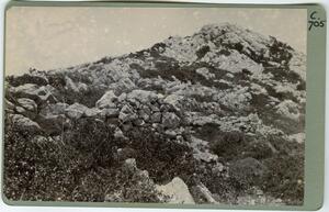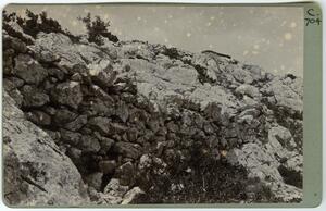 Part of a collection of images of the BSA's 1920s excavations at Mycenae. The original description in the SPHS negative register reads: "Mycenae, H Elias summit, Mycenaean wall N. side". Recorded in the register as from the 1922 season.