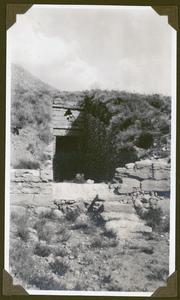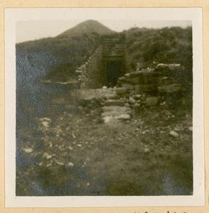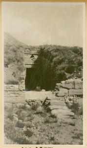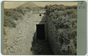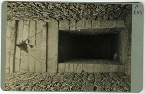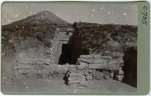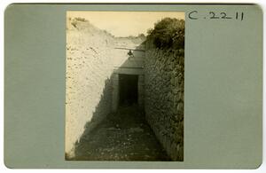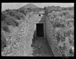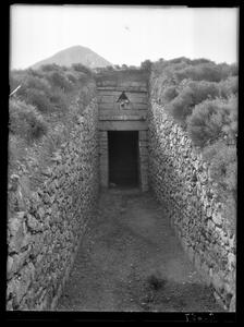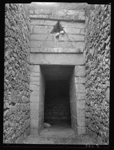 Part of a collection of images of the BSA's 1920s excavations at Mycenae. The original description in the SPHS negative register reads: "Mycenae, perfect tholos, detail of door".