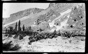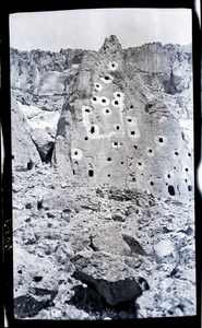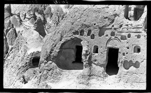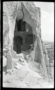 Part of a collection of images from Dawkins' travel to Cappadocia and Pharasa between 1909 and 1911. The original description in the SPHS register reads: "Rock cut dwellings of [Soghanlü]".