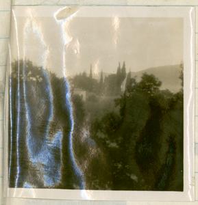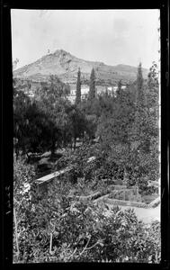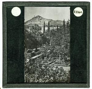 One of a group of images relating to the British School at Athens: buildings and setting, scholars and students. The original description in the SPHS register reads: "Athens: Lycabettus from BSA garden".