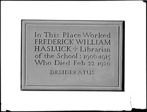 One of a group of images relating to the British School at Athens: buildings and setting, scholars and students. The original description in the SPHS register reads: "Hasluck memorial tablet".