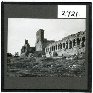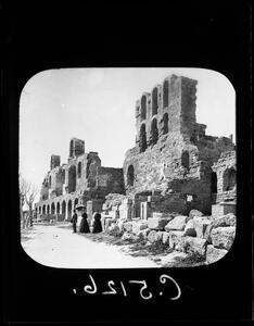 The original description in the SPHS register reads: "Athens: Acropolis. Odeion of Herodes. Interior stage buildings looking W".