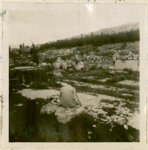 With a woman in the foreground [possibly Hilda White] sitting on [part of the fountainhouse, Enneakrounos] with her back to the camera.
