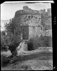 Part of a collection of images from the travels of Hasluck and Woodward to Rhodes, Telmessos, Attaleia [Adalia], Perge, Sillyon, and Aspendos in 1909 (BSA 15: 368). The original description in the SPHS register reads: "Adalia: Pergamene (?) round tower (K in Lanckoronski).".