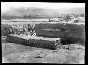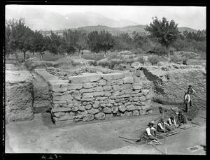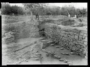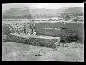Part of the collection of images, 1906-1910, of the British School at Athens excavations at Sparta, Laconia. The original description in the SPHS register reads: "Sparta: Orthia, inside of temple wall BSA".