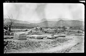 Part of the collection of images, 1906-1910, of the British School at Athens excavations at Sparta, Laconia. The original description in the SPHS register reads: "Sparta: Orthia, Roman altar".